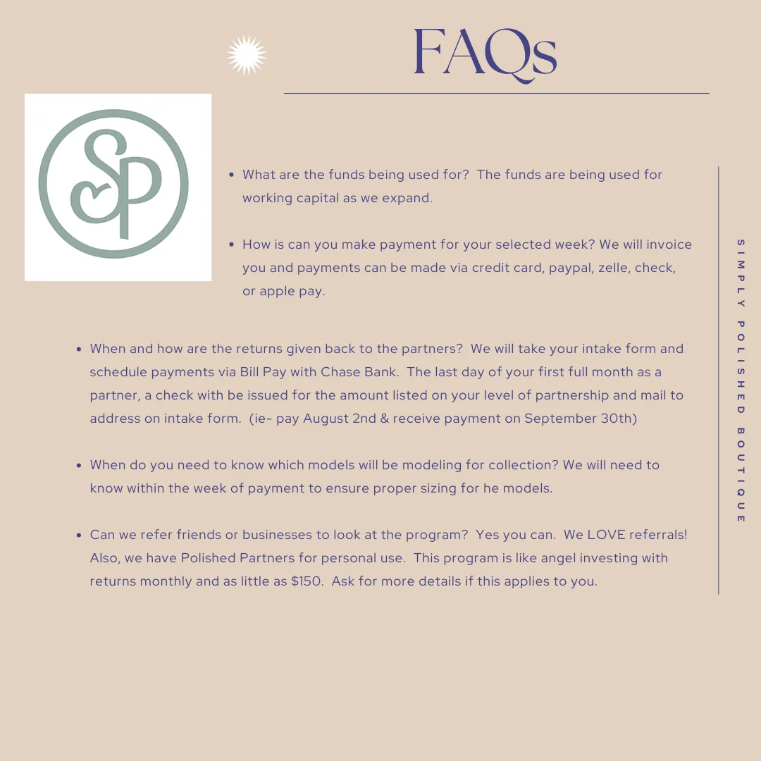 Simply Polished Boutique is excited for this expansion campaign helping reach the needs of our growing community. Your partnership will help us grow at the same time giving you a return on your money better then what you will see at the bank and many funds currently. It is a win/win partnership where you can be part of the success of this amazing company's mission of helping busy women find their signature looks. We have a limited number of Polished Partner spots available so act today. Thank you so much for your partnership.